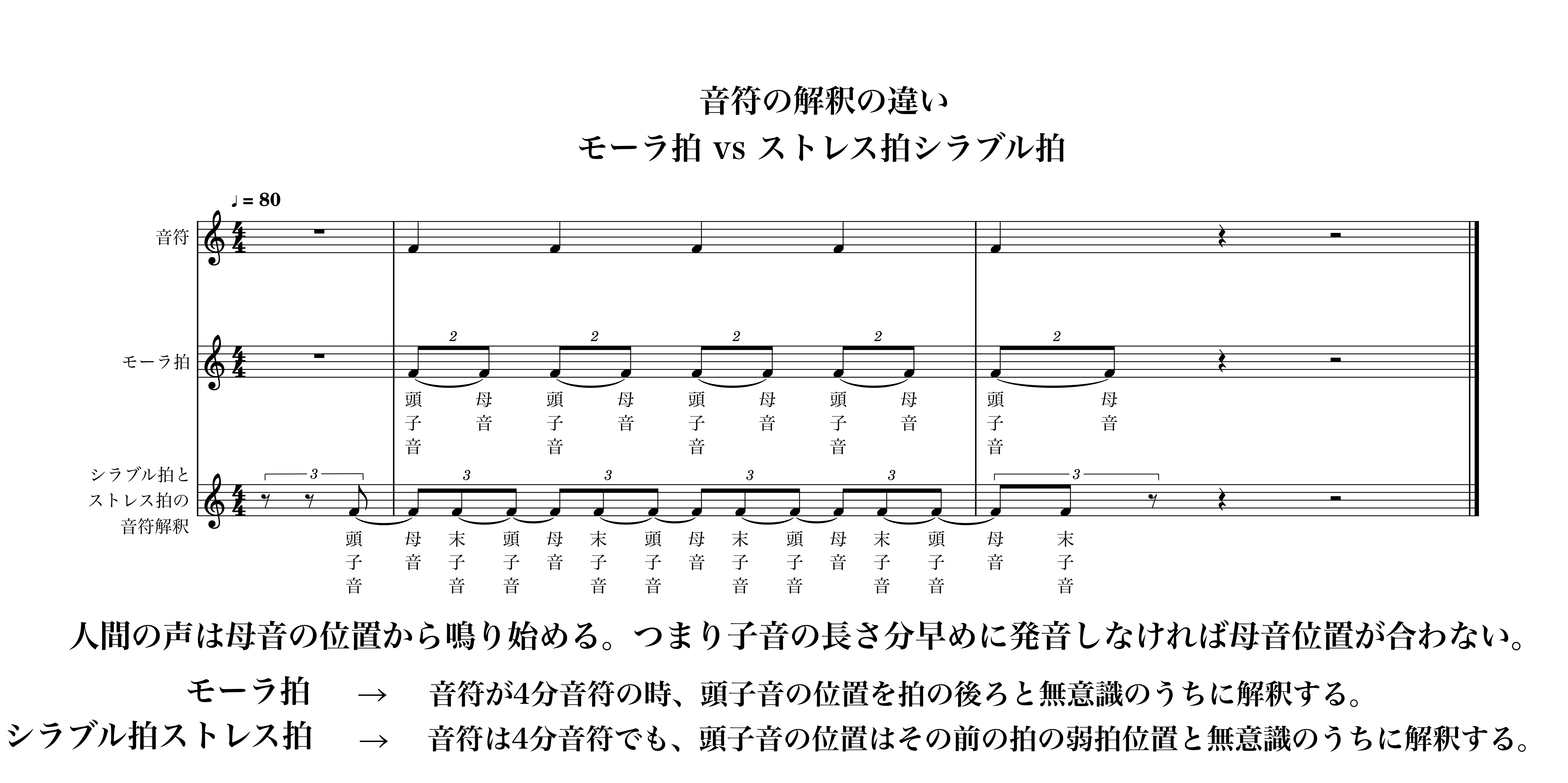 日本人がグルーヴを感覚的に理解できない理由はここにあります。─── 英語の音楽が何故3⁻ⁿになるのか…と表現するより、日本語の音楽が何故2⁻ⁿになるのかと表現した方がより本質を言い当てています。世界中のリズムの大半はシラブル拍リズムで末子音を持っています。末子音をもたない日本語のリズムの方がずっと奇異なのです。